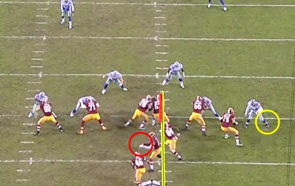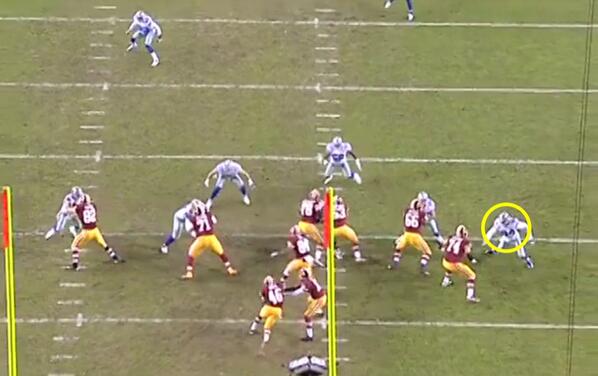 He lines up opposite Tyler Polumbus, the Redskins right tackle. Polumbus has struggled with pass protection his entire career, so DeMarcus Ware provides a very good match up for the Cowboys.