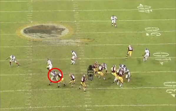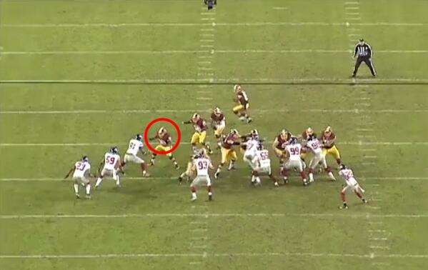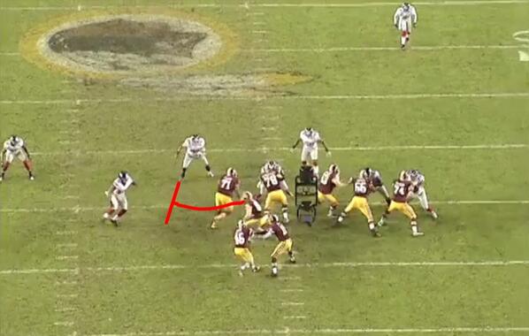 Fullback Darrel Young is the player assigned with blocking Tuck on this play, but Tuck has to wait until he knows Griffin has kept the ball before he engages with Young.