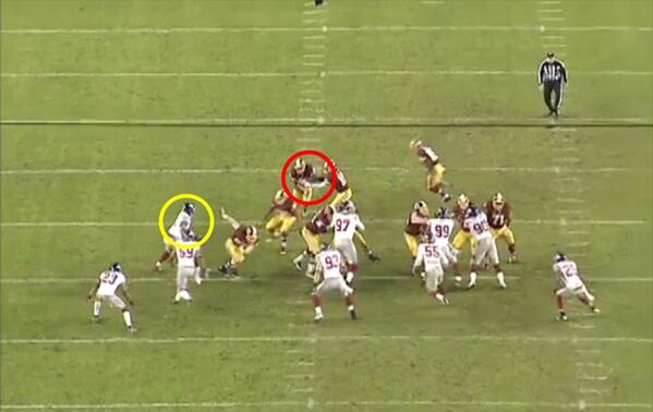 Umenyiora takes a few steps upfield, but hesitates through the mesh point. He appears to be left unblocked, which helps sell the read-option fake further. But tight end Logan Paulsen is sifting back across the line to block him.